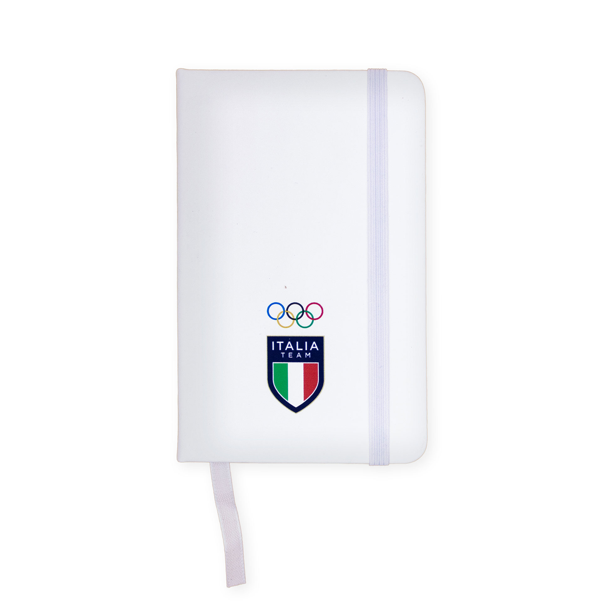 TACCUINO ITALIATEAM IN PU BIANCO, FORMATO A6, 96 PAGINE A RIGHE, ELSATICO E SEGNALIBRO IN TINTA, LOGHI OLYMPIC EMBLEMA E SCUDO ITALIA TEAM COLORATI