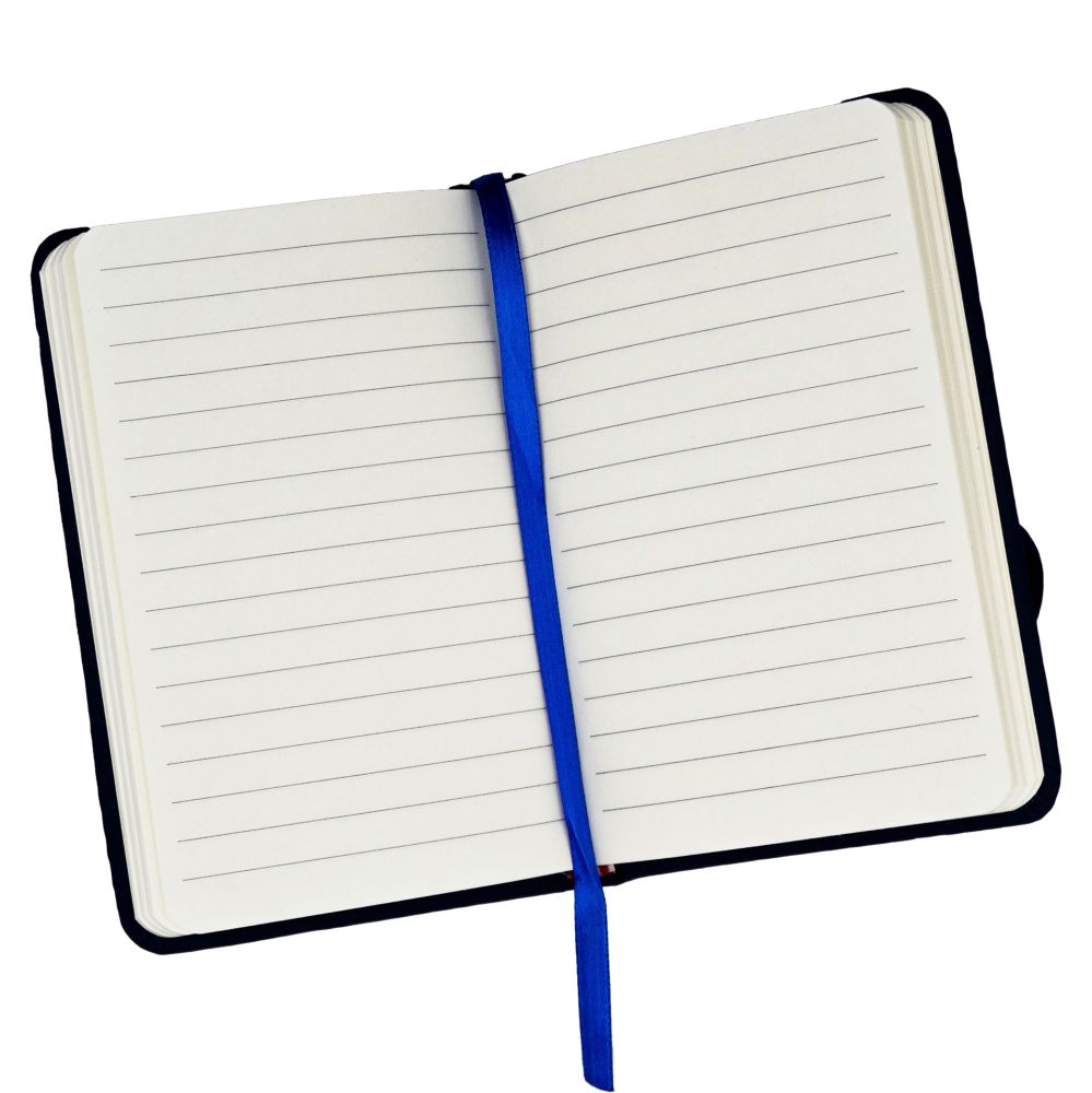 TACCUINO IN PU BLU,FORMATO A6, 96 PAGINE A RIGHE, ELSATICO E SEGNALIBRO IN TINTA, LOGHI PARALYMPIC EMBLEMA E ITALIA PARALYMPIC TEAM BIANCHI
