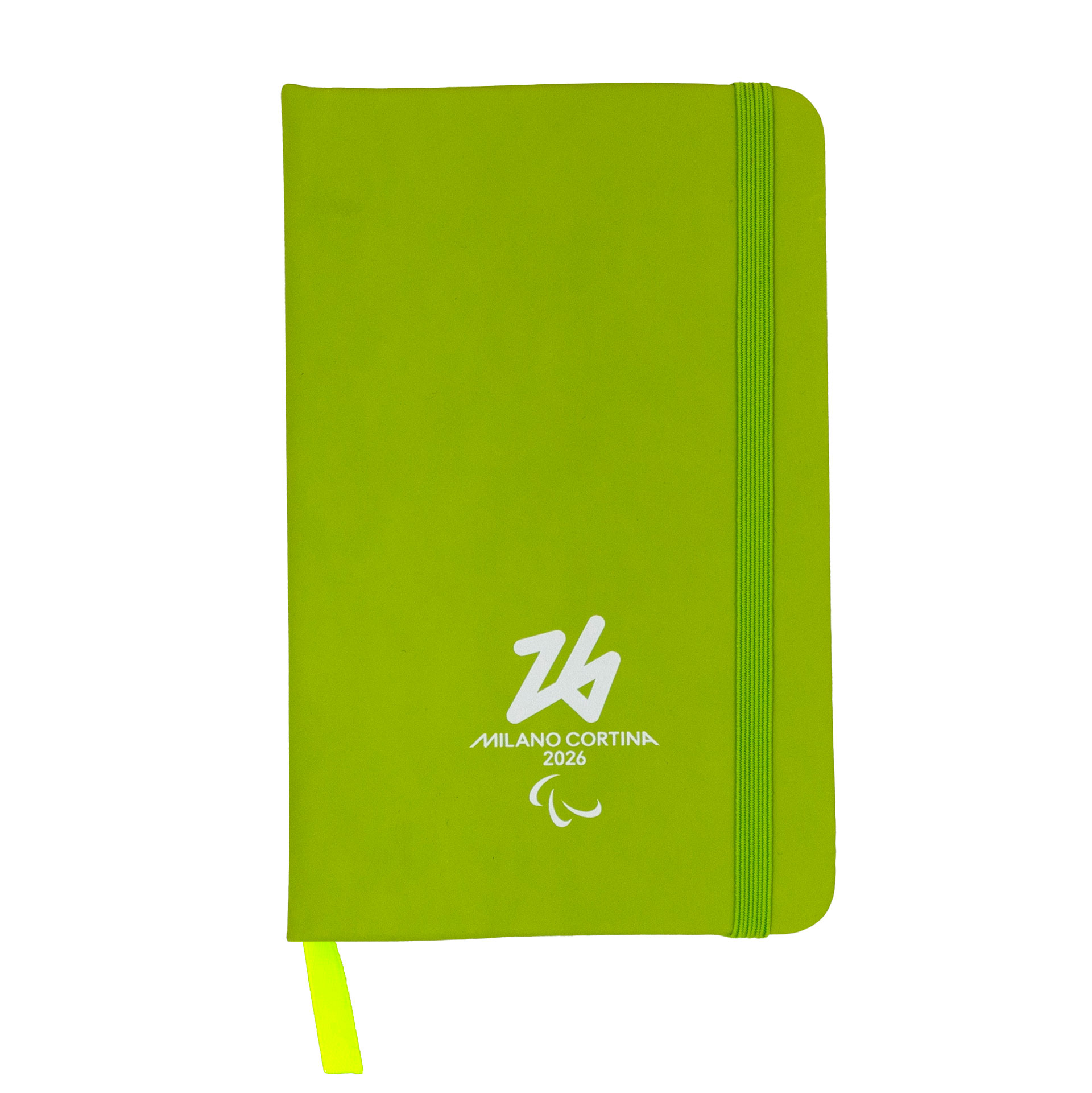 TACCUINO OLIMPIADI MILANO CORTINA 2026 IN PU, FORMATO A6, 96 PAG. A RIGHE, FONDO VERDE CHIARO, ELSATICO E SEGNALIBRO IN CONTRASTO, LOGO PARALYMPIC EMBLEMA MONOCROMATICO BIANCO