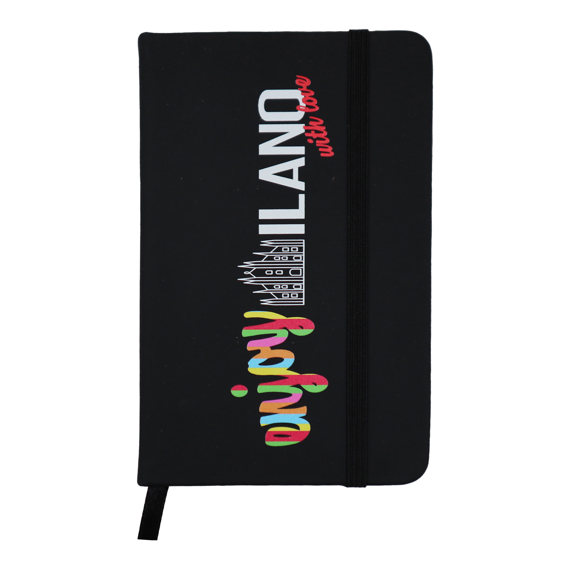 TACCUINO NERO FORMATO A6 CON COPERTINA RIGIDA CHIUSURA CON ELASTICO 14X9X1,5 CM MILANO WITH LOVE