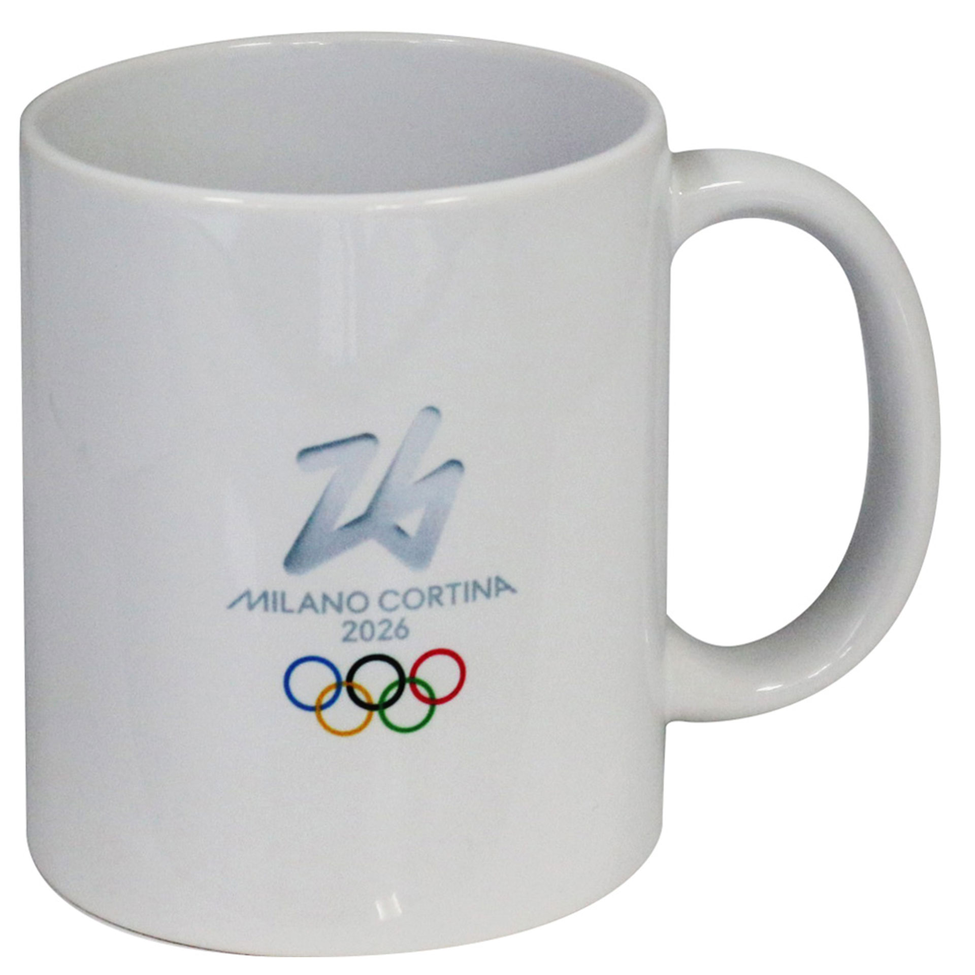 TAZZA MUG OLIMPIADI MILANO CORTINA 2026 IN CERAMICA DA COLLEZIONE DIMENSIONI DIAMETRO 8 CM LOGO OLYMPIC MASCOT TINA E THE FLO COLORATO 5 CERCHI SU FONDO BIANCO