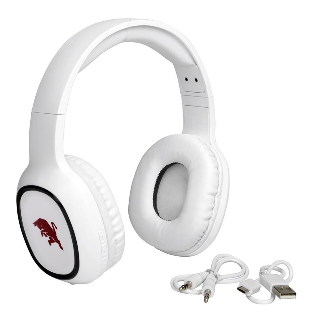 CUFFIE WIRELESS COLORE BIANCO CON TORO OLD 200 MAH IMBOTTITE E REGOLABILI CON FUNZIONI DI CONTROLLO INTEGRATE, PORTATA CIRCA 10 M, DURATA DELLA BATTERIA DI CIRCA 5 - 6 ORE, INCLUSO CAVO DI RICARICA USB DI CIRCA 50 CM, COLLEGAMENTO PER LA PRESA JACK DI CIRCA 50 CM DA 3,5 MM, TORO OLD STAMPATO A 1 COLORE GRANATA SU AMBO LE PARTI