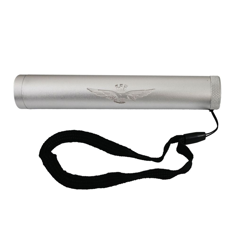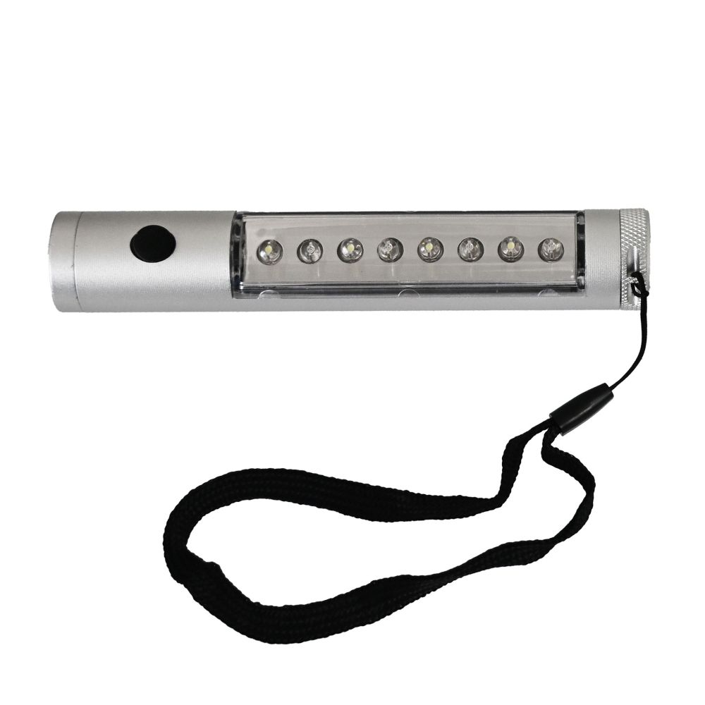 Torcia LED FLASH: punta 7 luci led bianchi e 3 rossi, lato 18 luci led bianchi e 6 rossi, 3 funzioni di illuminazione, magnete sull’estremità, struttura leggera e robusta in alluminio, laccetto nero in nylon. (batterie 3 x AAA escluse).