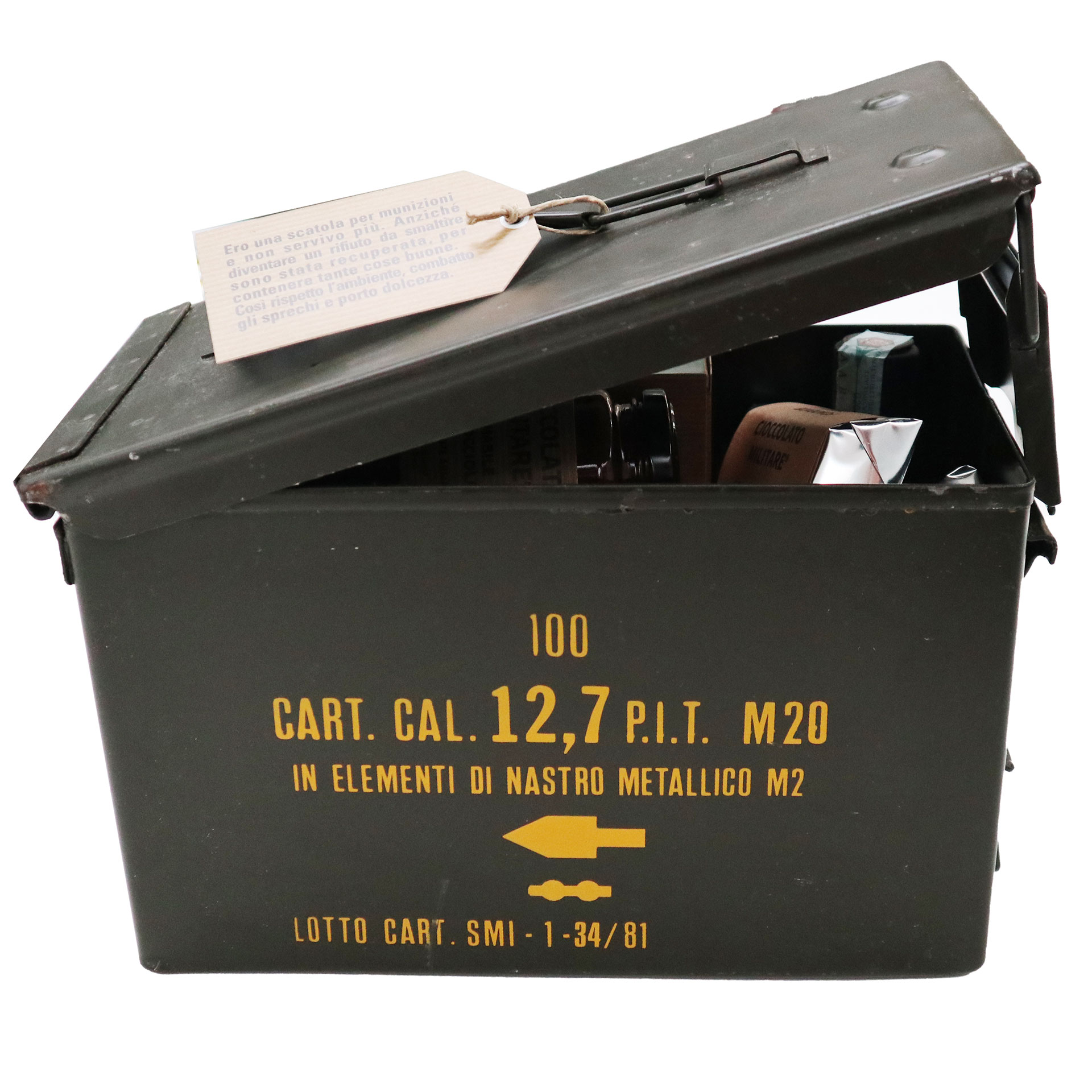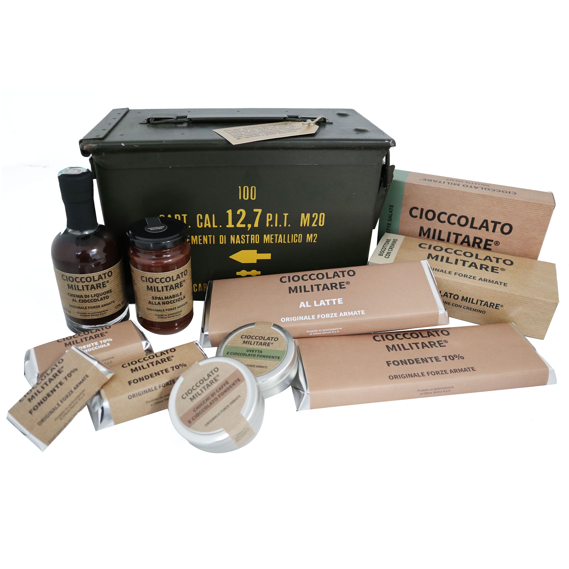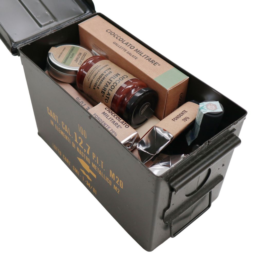 CONFEZIONE IN METALLO ORIGINALE CON 11 PRODOTTI CIOCCOLATO MILITARE: